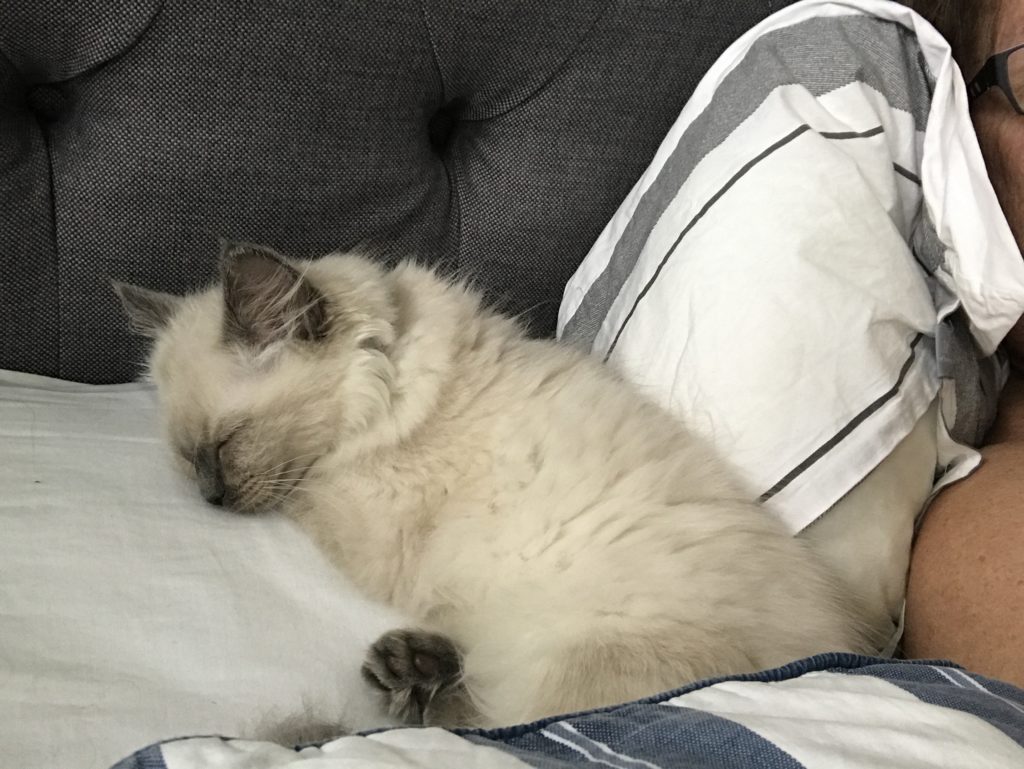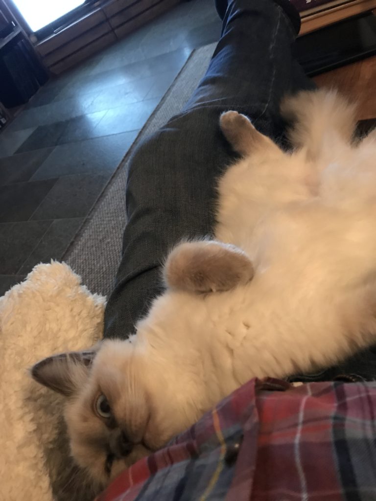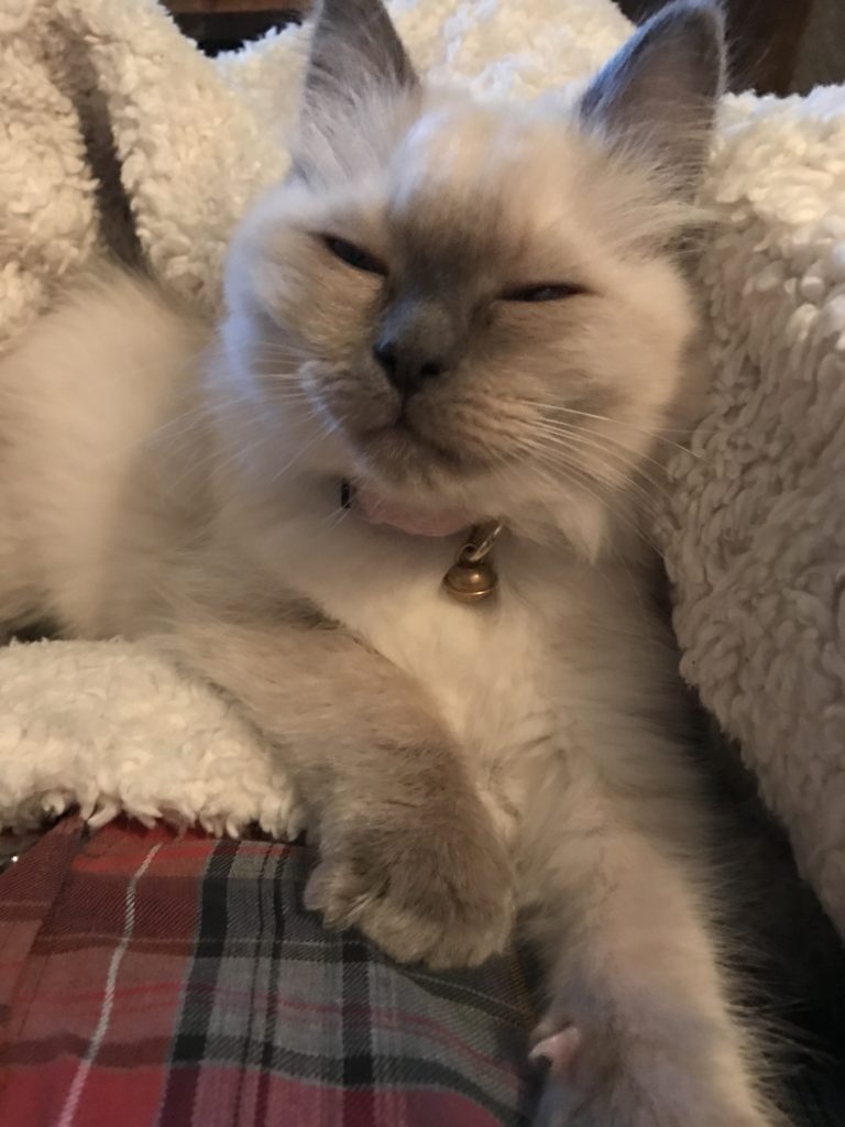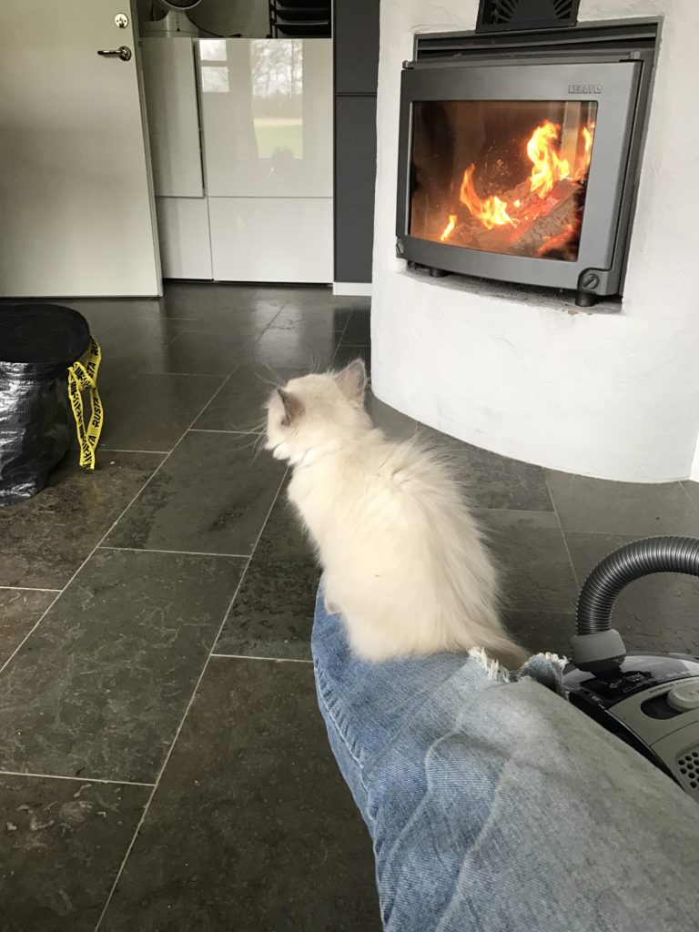 Jag har en skön stol framför brasan som hon gärna ligger i till brasans värmande sken. Hon brukar jama på mig och ger sig inte förens jag slår mig ner och hon har fått lagt sig på mitt knä.
