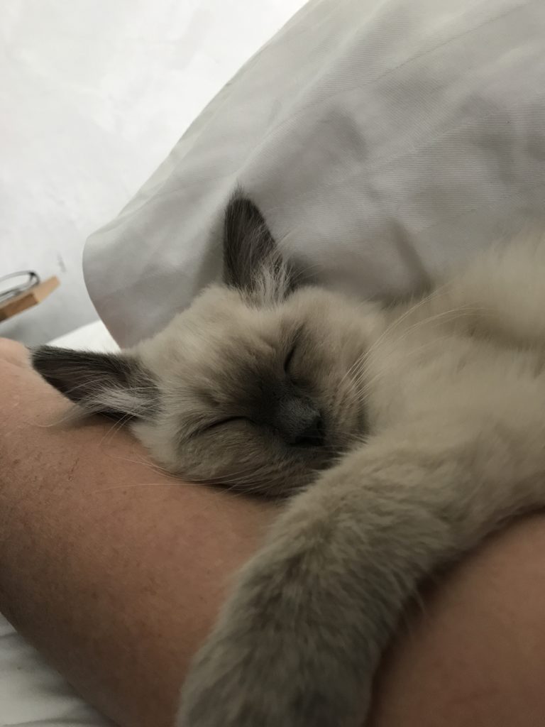 Vårt första möte blev känsloladdat då Sookie va den enda av kattungarna som nyfiket kom fram och luktade på mig. Därefter klättrade hon rakt upp till mitt ansikte. Sånt kan få vilken människas hjärta som helst att smälta
